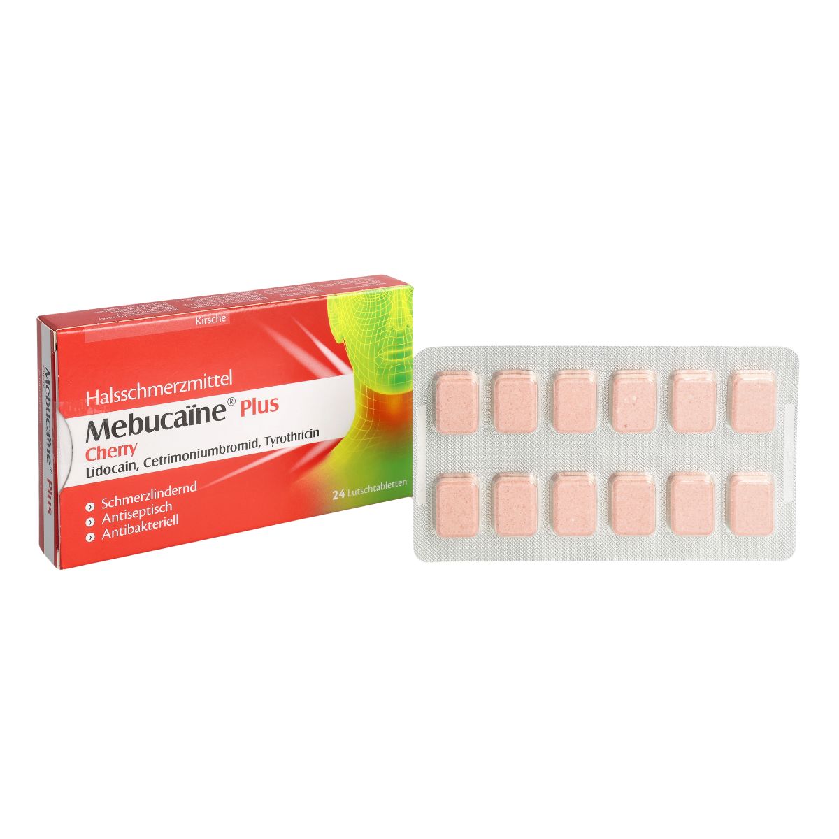 Mebucaïne® Plus Cherry Lutschtabletten zur lokalen Behandlung von Entzündungen des Mund- und Rachenraums, insbesondere von Halsschmerzen. Die Wirkstoffe Tyrothricin und Cetrimoniumbromid wirken antibakteriell und desinfizierend. Lidocain wirkt gezielt schmerzlindernd an Ort und Stelle, direkt im Hals, dort, wo es schmerzt. Die Lutschtabletten mit Kirschengeschmack sind einfach einzunehmen.