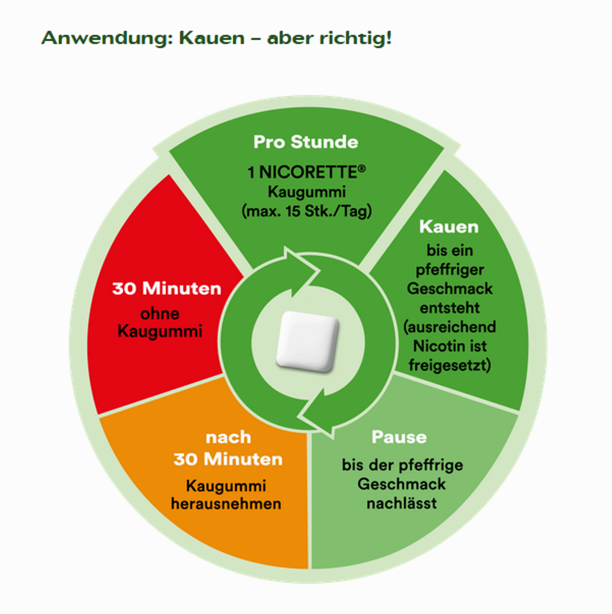 Die meisten Raucher benötigen pro Tag 8-12 wirkstoffhaltige Kaugummis der geeigneten Dosierung. Nach Bedarf können bis zu 15 Stück NICORETTE® wirkstoffhaltige Kaugummis pro Tag gekaut werden.
