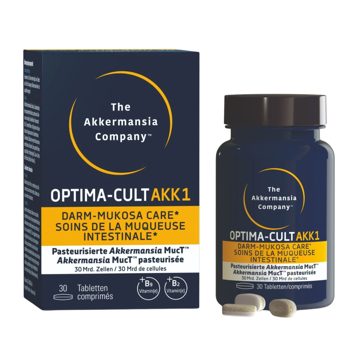 OPTIMA-CULT AKK1 ist ein Nahrungsergänzungsmittel mit 30 Milliarden pasteurisierten Zellen von Akkermansia muciniphila pro Tablette, ergänzt mit Vitamin B2 (Riboflavin), Folat (Vitamin B9) und Kamillenblüten-Extrakt.