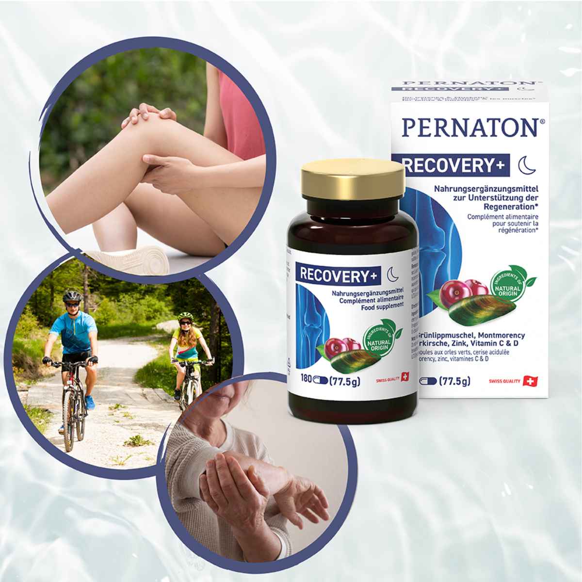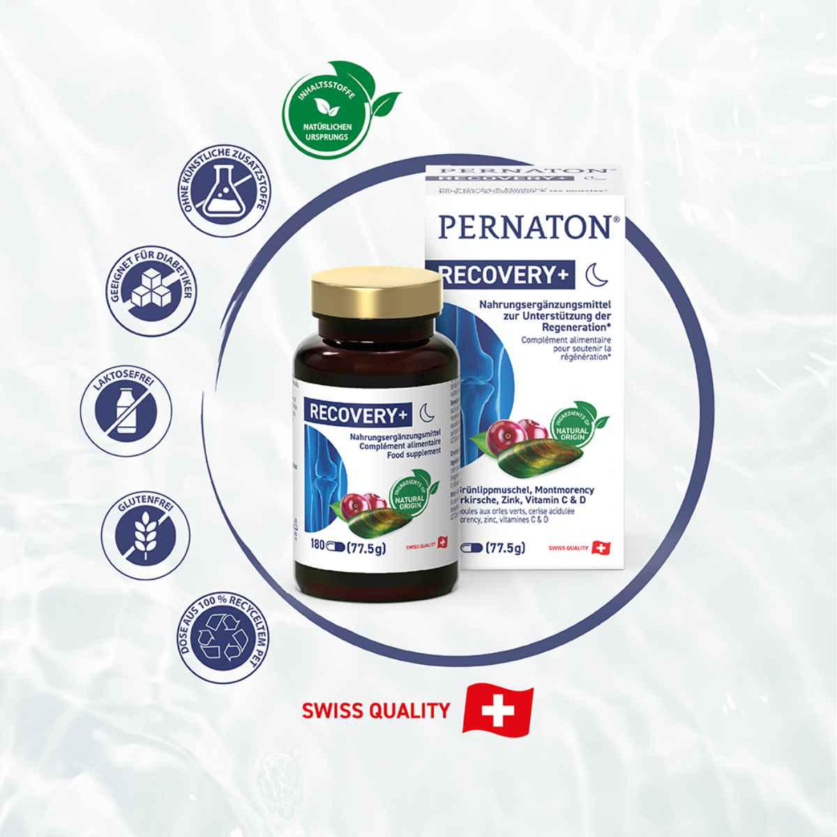 Pernaton Recovery+ ist ein hochwertiges Nahrungsergänzungsmittel mit 61 % Grünlippmuschel-Extrakt aus Neuseeland, kombiniert mit Montmorency Sauerkirschen-Extrakt sowie Vitamin C, Vitamin D und Zink.