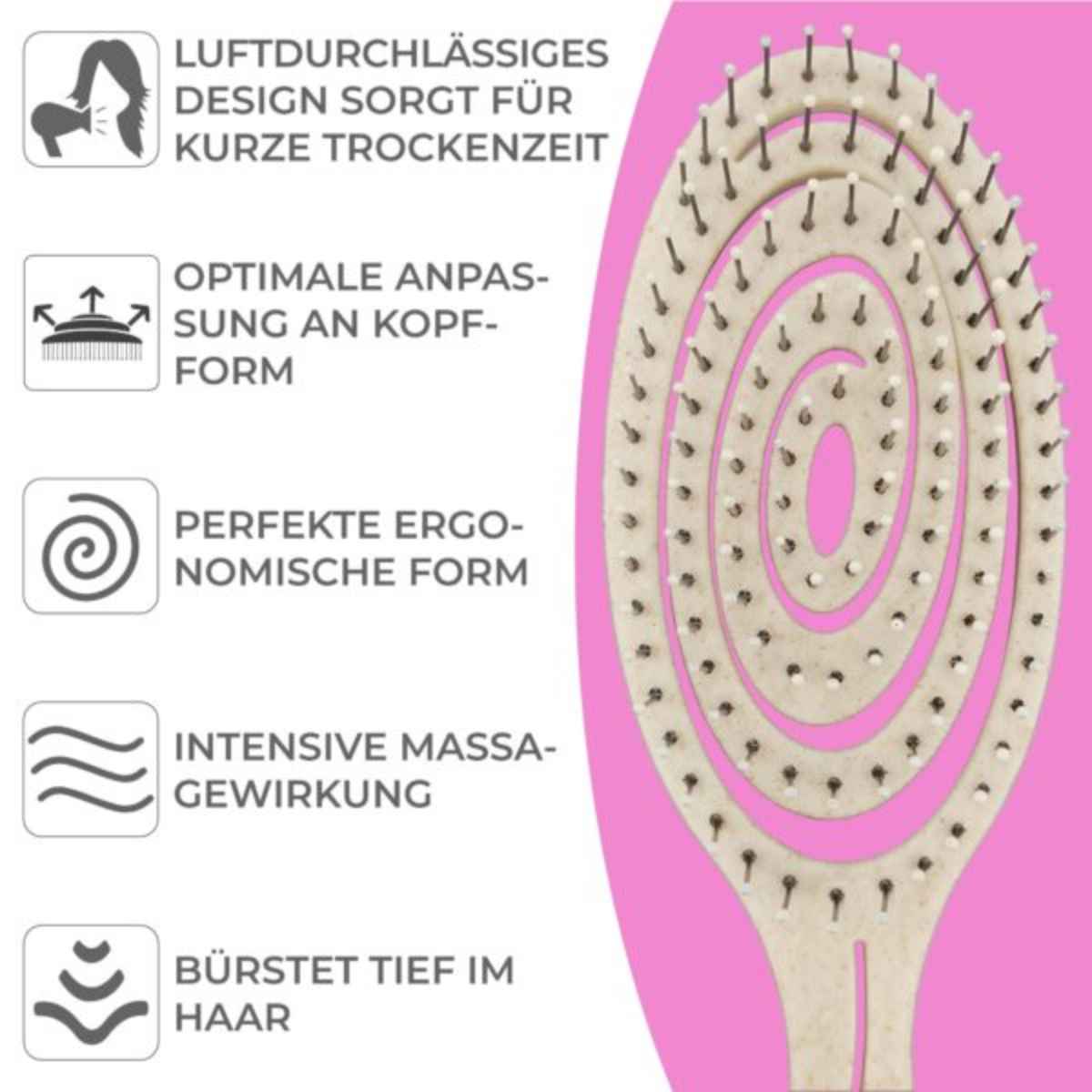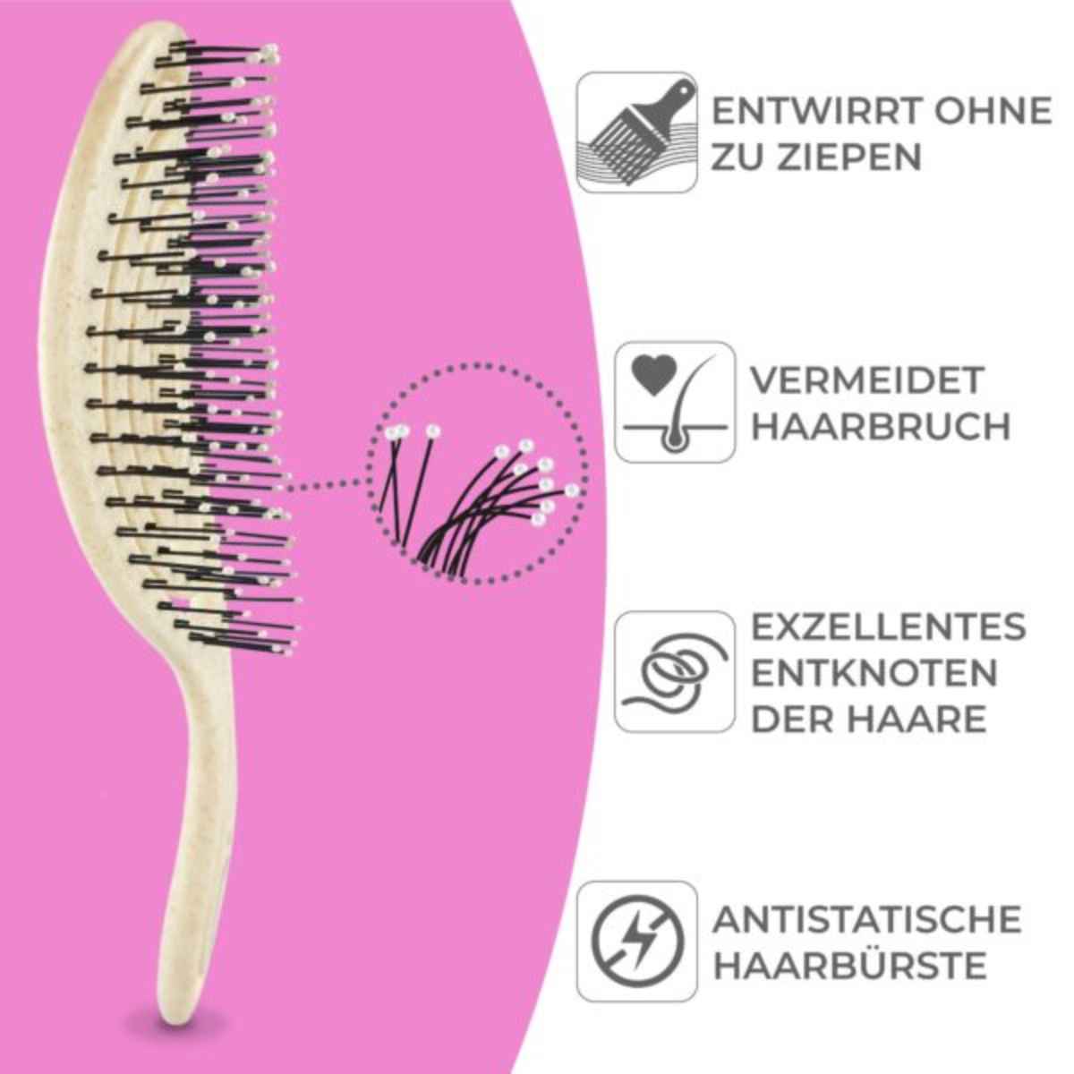 Das luftdurchlässige Design ermöglicht ein schnelleres Trocknen beim Föhnen. Die antistatische Wirkung hilft, Frizz zu reduzieren und die Kämmbarkeit zu verbessern.