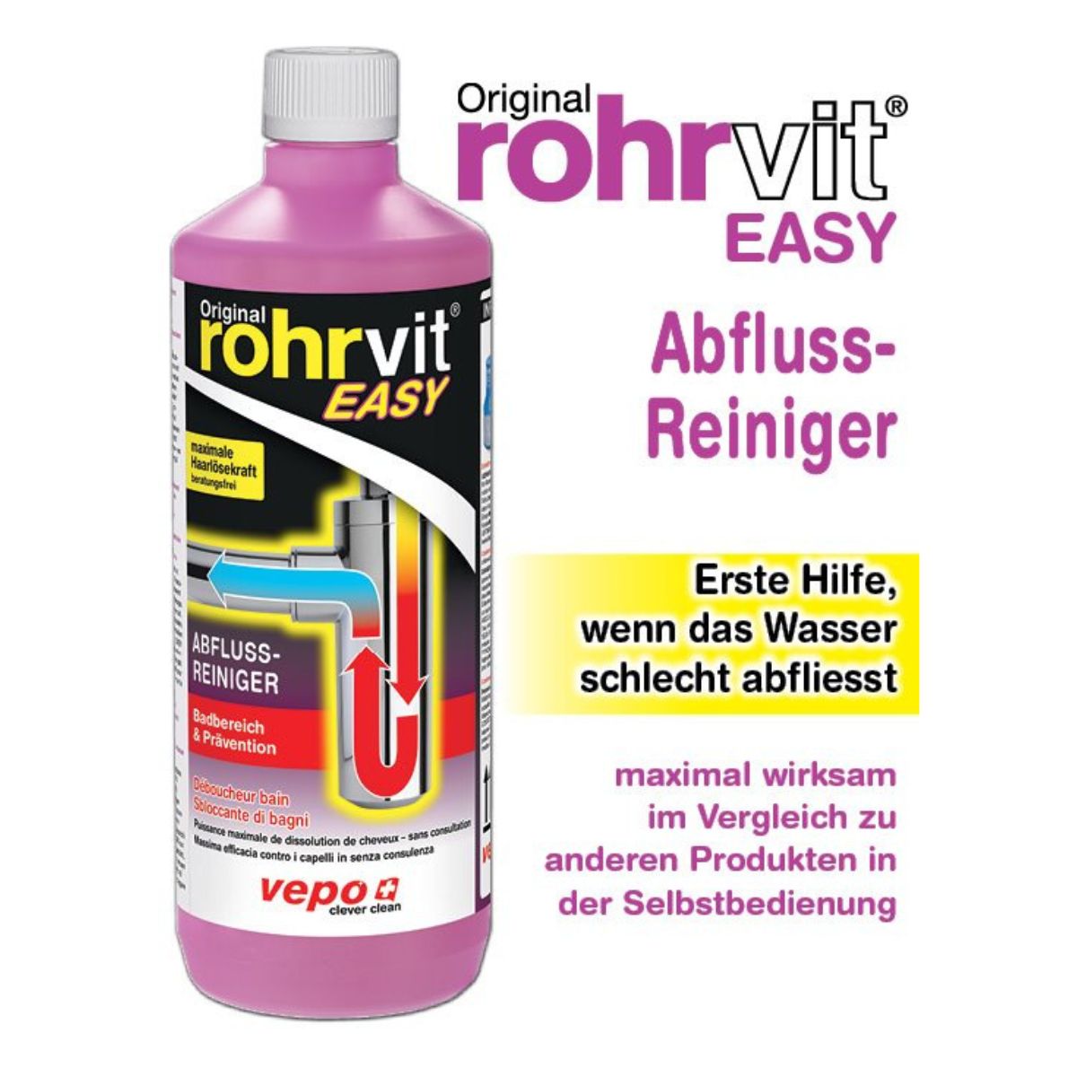 Der Rohrvit EASY Abflussreiniger ist ein gebrauchsfertiges Produkt zur effektiven Reinigung von Abflüssen in Badezimmern. Mit seiner speziellen Formel zersetzt er Haare und Seifenreste schnell und gründlich, wodurch unangenehme Gerüche beseitigt und Verstopfungen vorgebeugt werden. Ideal für den Einsatz in Duschen, Badewannen und Lavabos.
