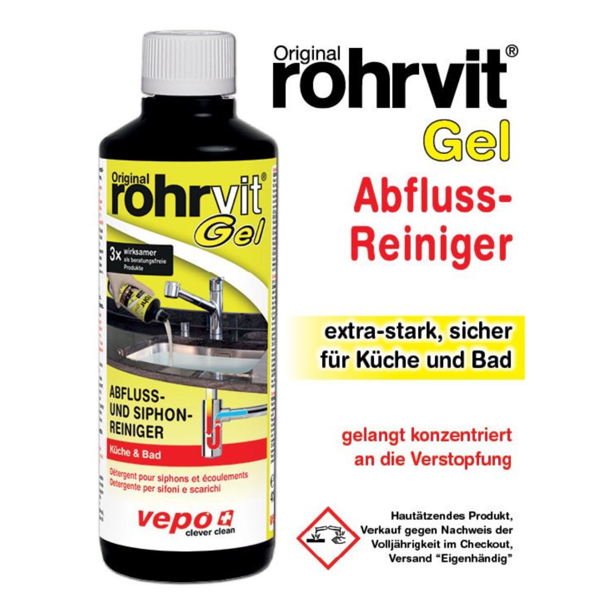 Das Rohrvit Gel Extra-Stark ist ein gebrauchsfertiger Abfluss- und Siphonreiniger aus der Schweiz, entwickelt für starke Verschmutzungen mit Fett, Speiseresten, Haaren, Seifenablagerungen oder Gemüse- und Rüstabfällen. Durch seine gelartige Formulierung gelangt das Reinigungsmedium sofort konzentriert durch stehendes Wasser zur Verstopfung – das beschleunigt die Wirkung gegenüber wässrigen Lösungen.