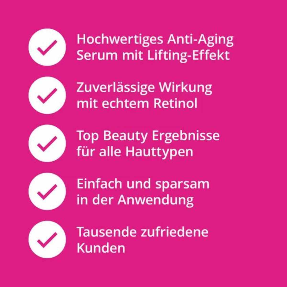 Hochwertiges Anti-Aging Serum mit echtem Retinol (Vitamin A), reiner Hyaluronsäure, Vitamin C und Vitamin E – feuchtigkeitsspendend und aufpolsternd für den besonderen Lifting-Effekt. Einfach und sparsam in der Anwendung. Für alle Hauttypen geeignet.