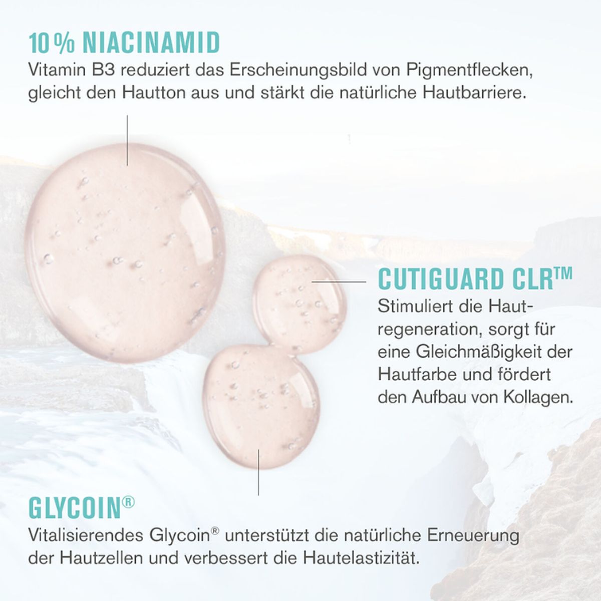 - 10 % Niacinamid: Beruhigt die Haut, reduziert Pigmentflecken und Rötungen, stärkt die Hautbarriere und sorgt für einen gleichmäßigen, klaren Teint.