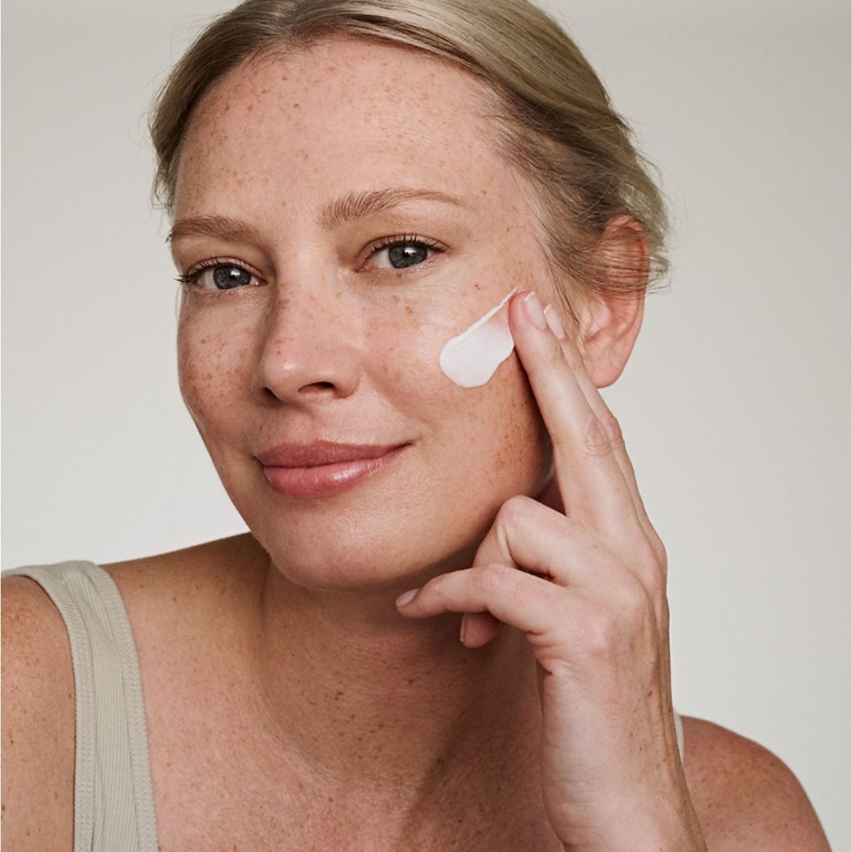Täglich morgens nach der Reinigung 1–2 Pumpstöße auf Gesicht, Hals & Dekolleté auftragen und sanft einmassieren.