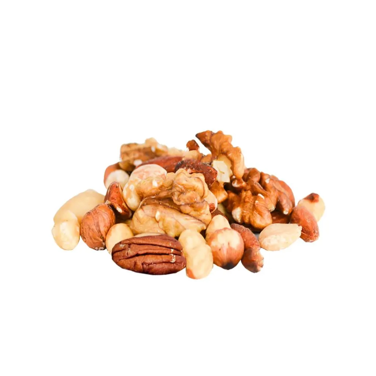Die Mischung umfasst Baumnüsse/Walnüsse, Mandeln, Cashewkerne, Haselnüsse und Pekannüsse.