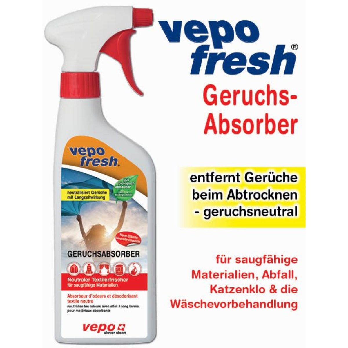 vepofresh® Geruchs-Absorber beseitigt Gerüche von Rauch, Nikotin, Fettdampf, Schweiss, Urin, Fauligem, Ausdünstungen von Katzenstreu, Abfällen etc.