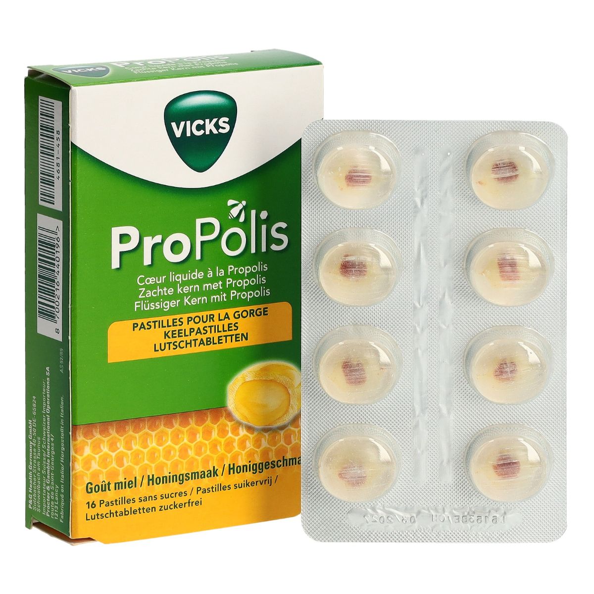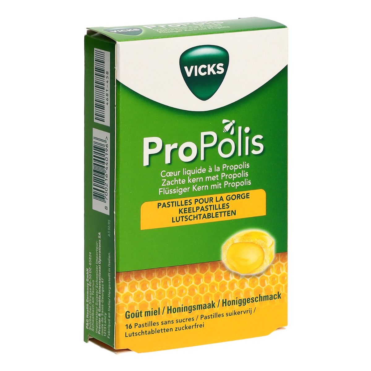 Die Vicks ProPolis Lutschtabletten vereinen Propolis in einem zarten Honiggeschmack mit einer innovativen Doppeltextur: Ein flüssiger Kern aus Propolis sorgt für sofortige Linderung, während die harte Außenschale langsam löst und so die Speichelproduktion anregt.