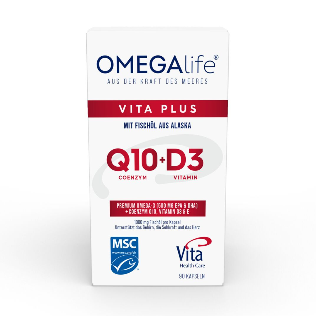 Fischöl-Konzentrat (Fischart: Sardelle, Sardine, Makrele aus Wildfang), Kapselhülle: Gelatine, Coenzym Q10, Feuchthaltemittel (Glycerin, Glycerinmonostearat), Farbstoff: Titandioxid, Vitamin E natürlichen Ursprungs.