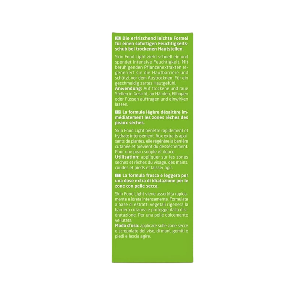 Skin Food Light ist besonders für unterwegs ein beliebter Begleiter: Skin Food Light zieht schnell ein und spart Platz in der Tasche - mit nur einer Creme kann der Durst trockener Hautstellen an Gesicht und Körper gelöscht werden.